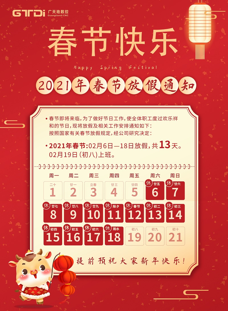 2021年春节将至,首先感谢您在2020年里的鼎力支持和愉快合作,完美电竞数控全体同仁在此给您拜个早年。在新年的一年里,完美电竞将更加努力,为您提供更优质的服务。按照国家春节放假规定结合我司的具体情况,春节放假时间安排如下: