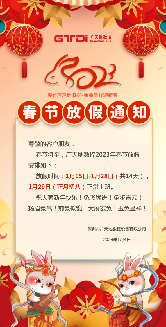 2023年春节将至,首先感谢您在2022年里的鼎力支持和愉快合作,完美电竞数控全体同仁在此给您拜个早年。在新年的一年里,完美电竞将更加努力,为您提供更优质的服务。按照国家春节放假规定结合我司的具体情况,春节放假时间安排如下: